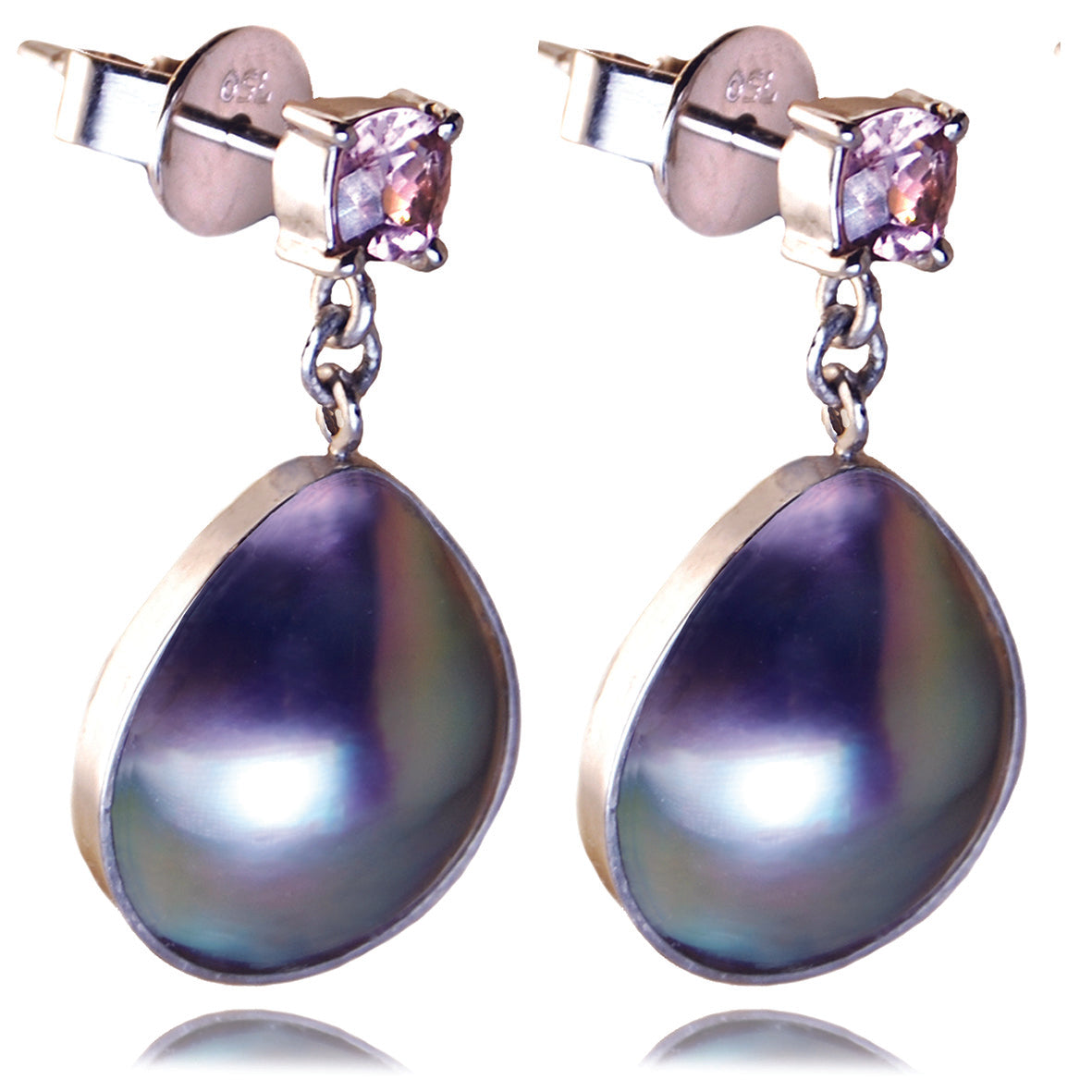 - Material: Grey-Purple Butterfly Oyster Mabe Pearls, 4x4mm pale Pink Tourmaline Square Cut Studs, 18ct white Gold Throughout.