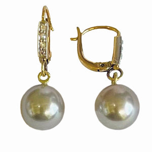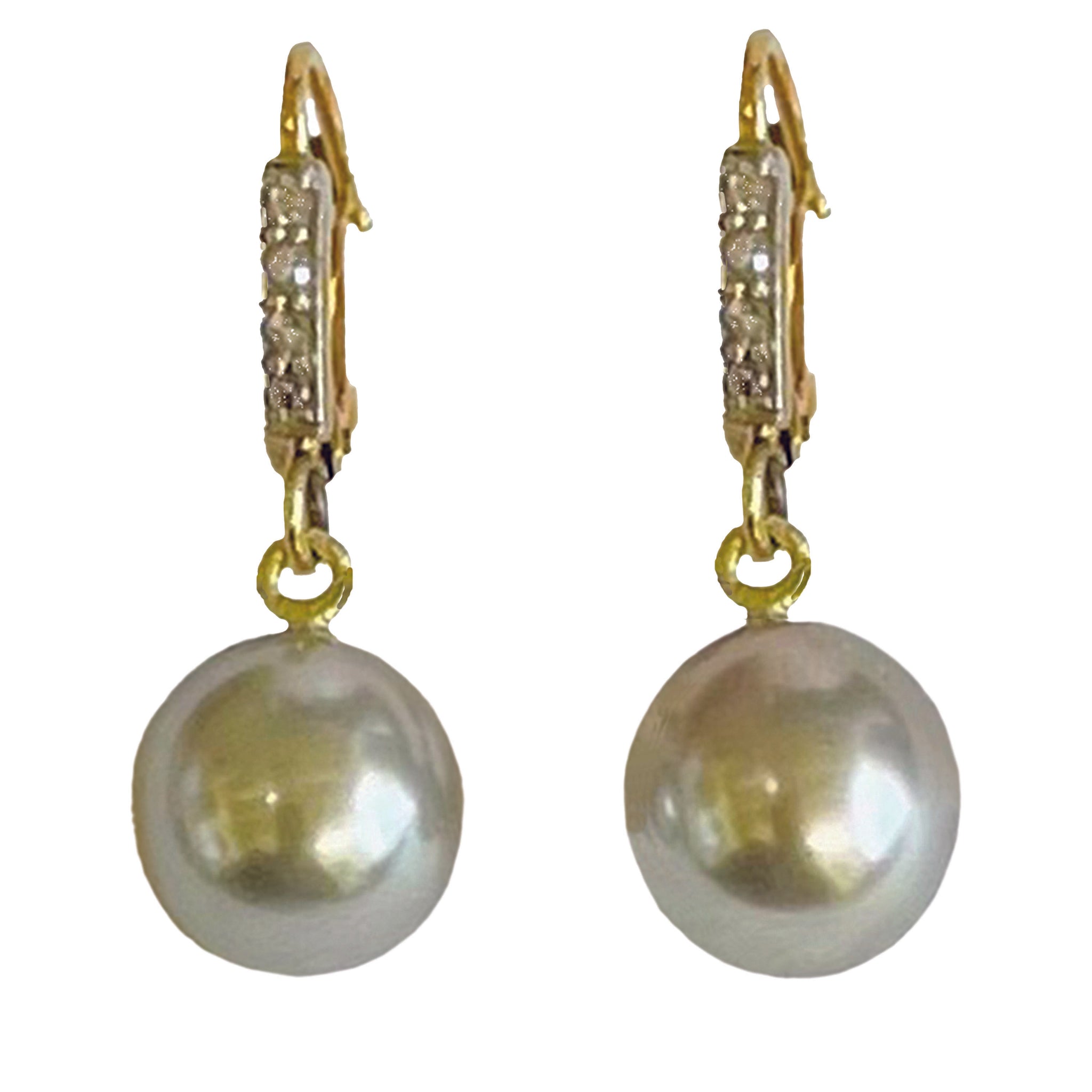 A pair of Belle Epoque earrings. Grey cultured Tahitian pearls hang suspended from an 18ct gold 'French setting', set with 8 (in total) sparkling rose-cut diamonds.