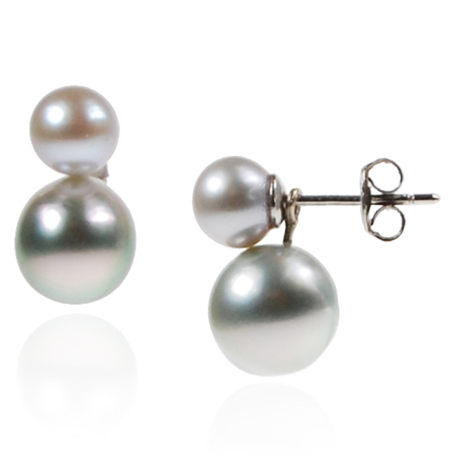 A single cool grey Tahitian pearl is suspended from a short 18ct white gold setting, adorned with matching Freshwater pearl studs. The “pearl-drop” of this elegant, vintage design creates an eye-catching classic look. These earrings can be worn alone or in combination with