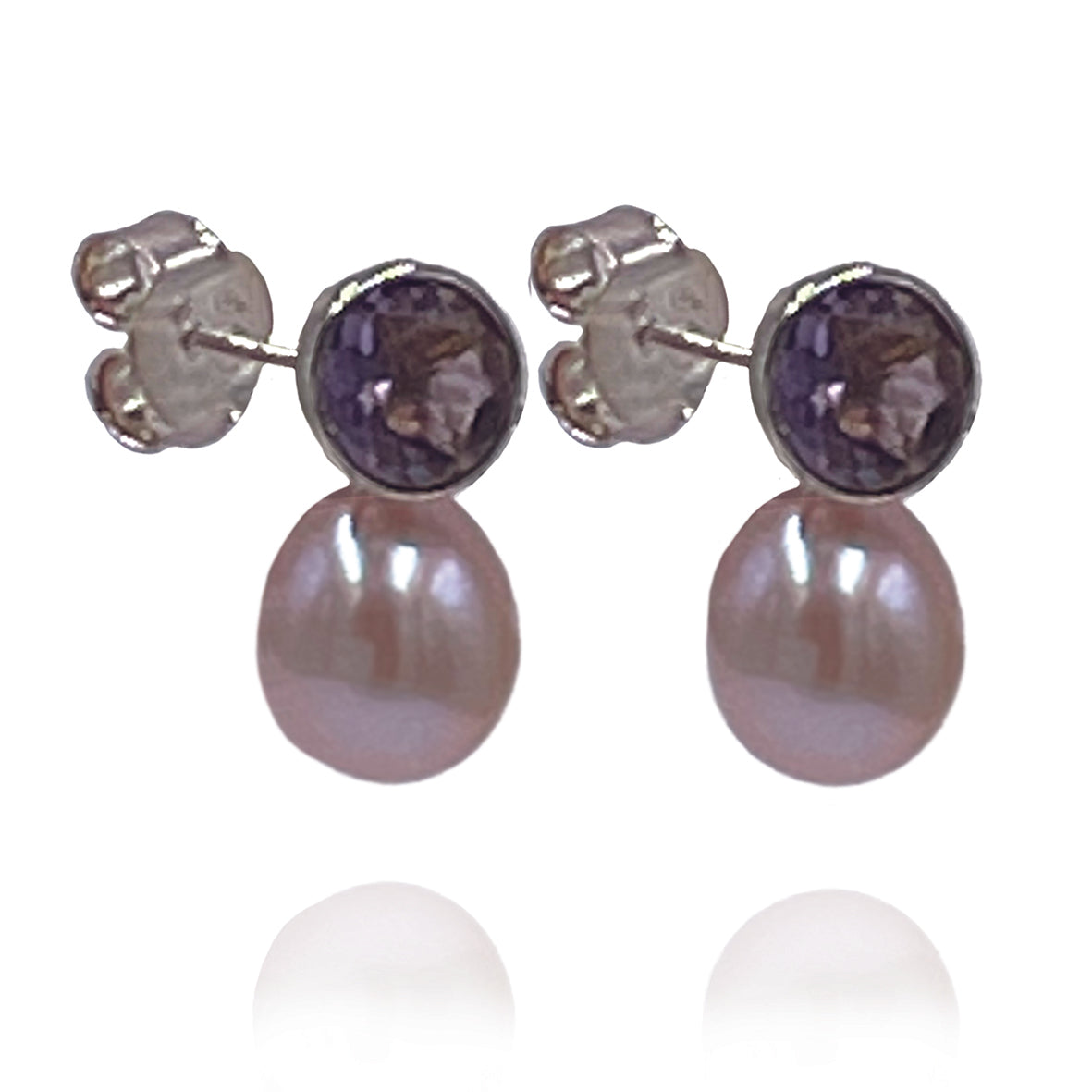 Inspired by the art deco style of the Great Gatsby where simple geometric shapes, and subtle, but vivid colours, drew attention. These elegant 'build your own' earrings consist of a pink Freshwater pearl suspended from deep purple amethyst. Wear the earrings alone or with a matching necklace to complete the look.