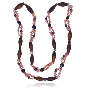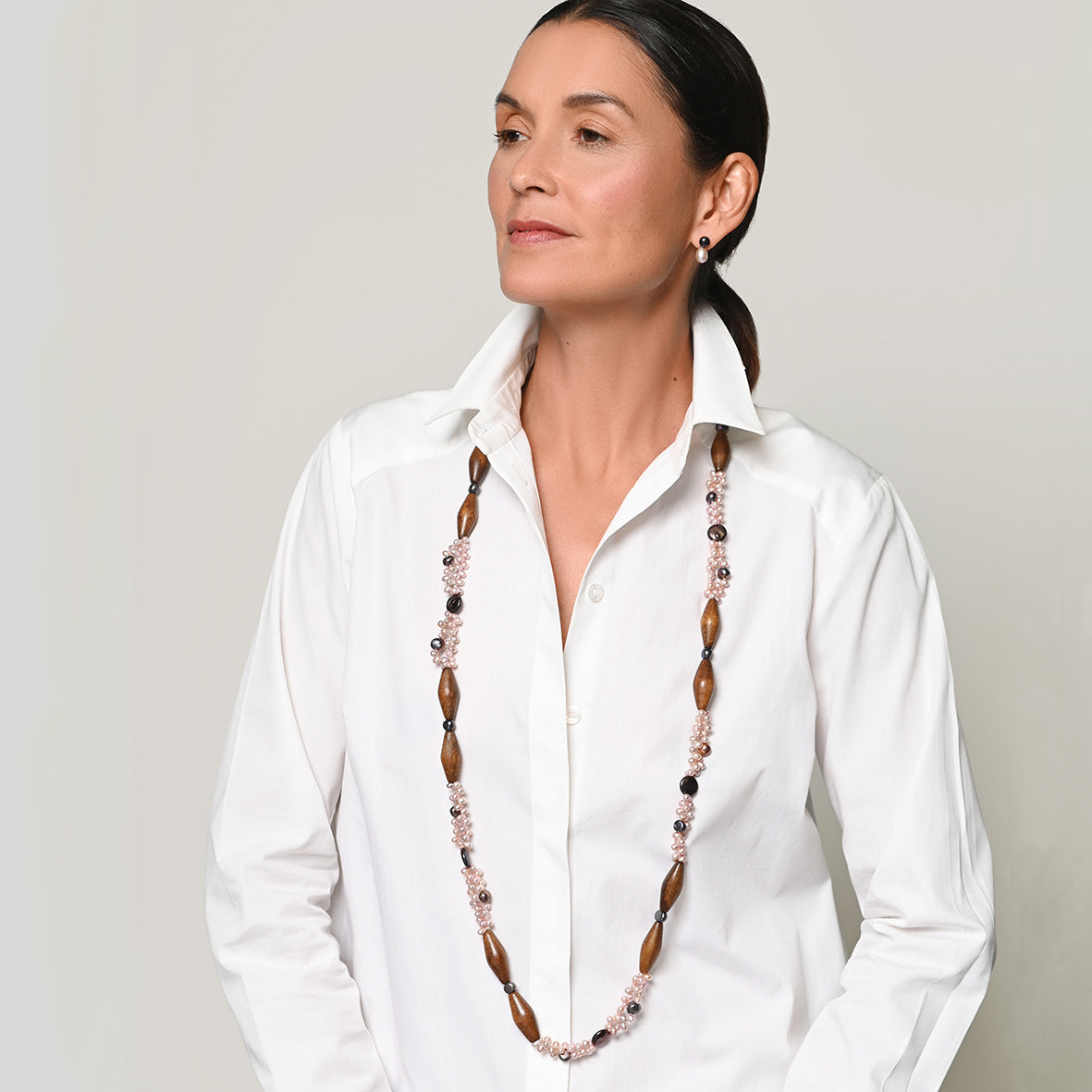 From our 'Fruits of the Forest' collection, strands of peachy pink and Peacock Freshwater pearls wrapped around raw wood, giving a rich depth of colour. The raw wood compliments the raw beauty of the pearl, evoking the basic elements of nature. Wear alone or combined with a matching pair of Black & Pink Freshwater Pearl Mini Silver Drop Earrings.