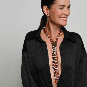 Amber - a liquid drop of honey-coloured resin hardens over millions of years to create this stunning organic gemstone. The sticky resin encases anything in its path (flies, leaves or delicate flowers) gifting us a rare snapshot into life frozen in time. Feel beautifully confident wrapped in warming hues of honey and stone coloured amber. Wear alone or coupled with our amber drop earrin, to pack a punch.