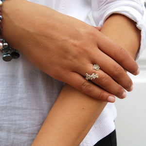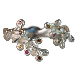 A sterling silver “Branch Ring”, hand-set with 10 multi-coloured sapphires and tsavorites, complete with a high polish finish. This delicate design was born from Chrissie’s daughter’s desire to evolve the traditional ring into a more treasured form. Taking inspiration from vivid coral reefs near Cuba she designed “bejeweled branches” to gently wrap around your ring finger. Please get in touch to order in your ring size.