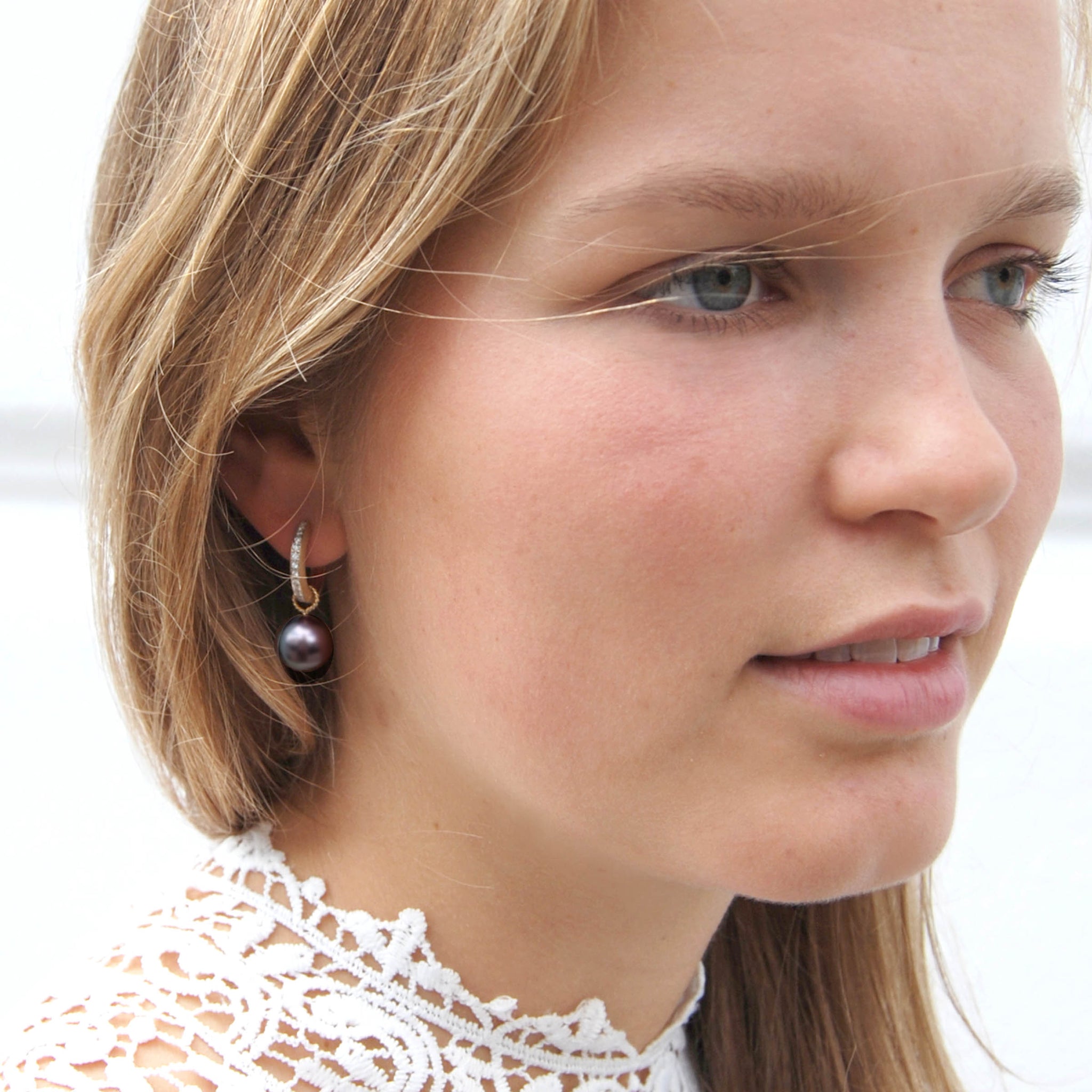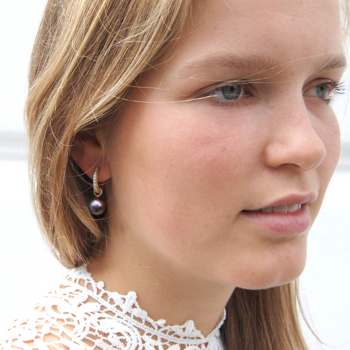 A classic Coleman Douglas Pearls creation. 18ct yellow gold hoop earrings set with 12 sparkling diamonds, dripping with detachable stormy Tahitian pearls. The versatility of this simple design knows no bounds (typifying Chrissie’s mix and match philosophy). These hoops can be combined with multiple pearl drops of differing colour and size, dependent on your mood and style. Couple this frosty pair of decadent diamond hoops with a matching Tahitian pearl necklace.