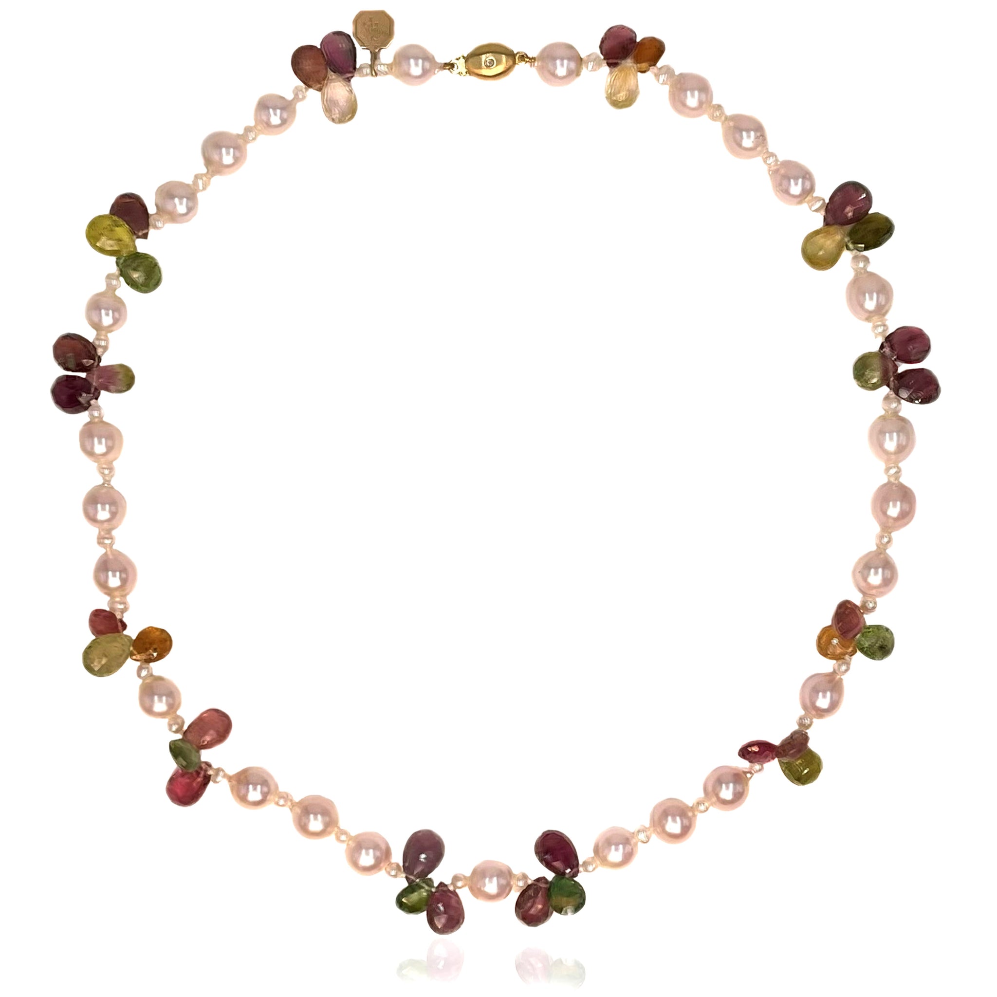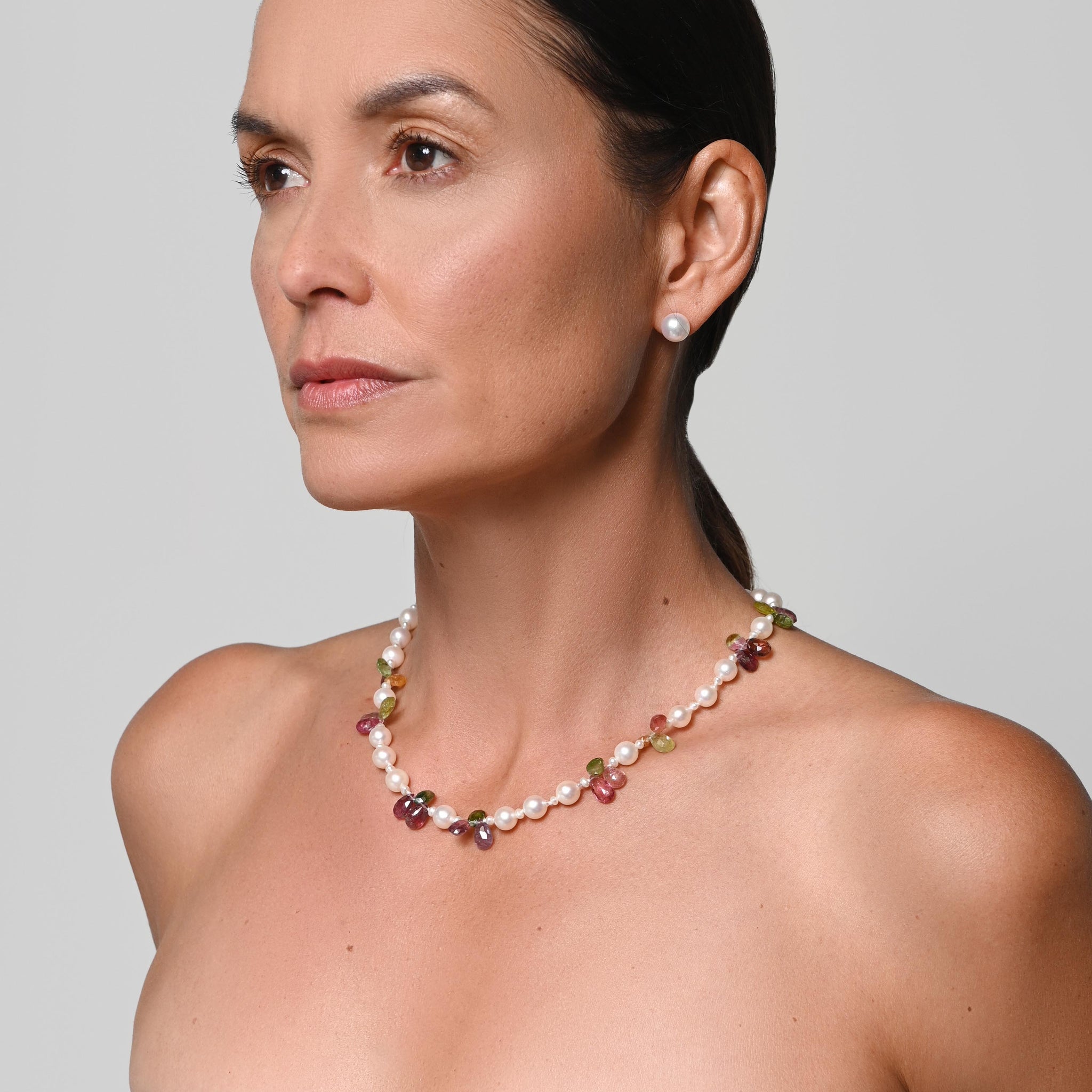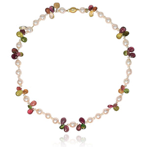 An award-winning design inspired by the vivid colours of Mexican coral reefs and sea life. This necklace consists of creamy white Akoya pearls, in dispersed with delicate white seed pearls, flanked by spirals of multicoloured tourmalines. The necklace can be worn alone or coupled with matching modern gold hoop earrings.