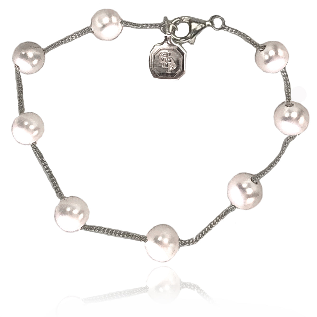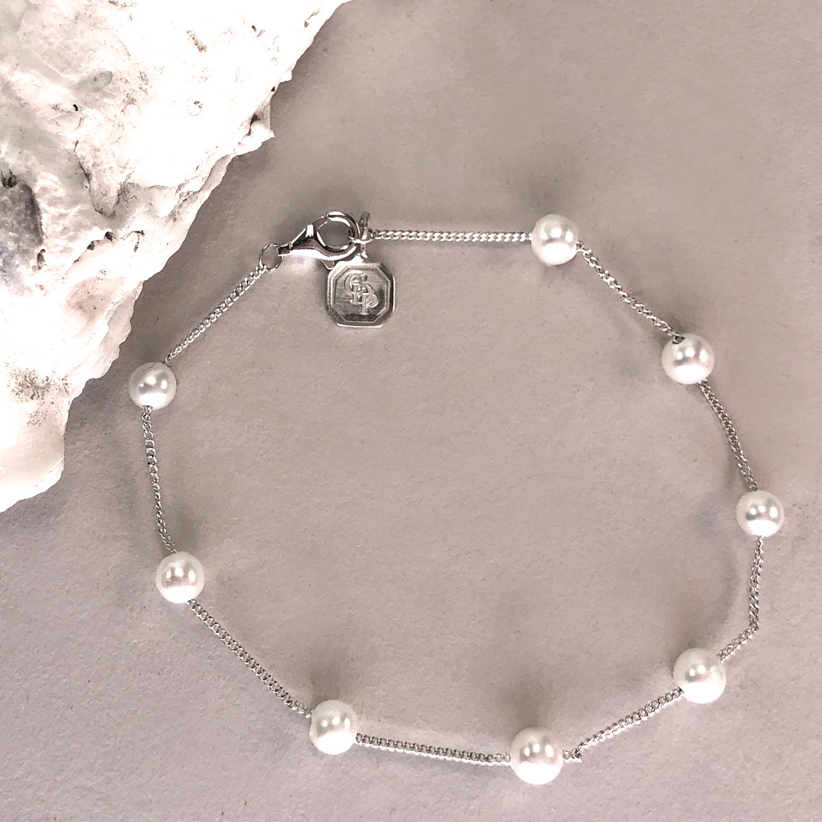 A Sterling Silver bracelet hand-set with creamy white Freshwater pearls. Evolved from our iconic pearl drop pendant, this design is an ideal everyday gift to yourself or a loved one. An understated design. Wear alone or layer with a matching necklace.