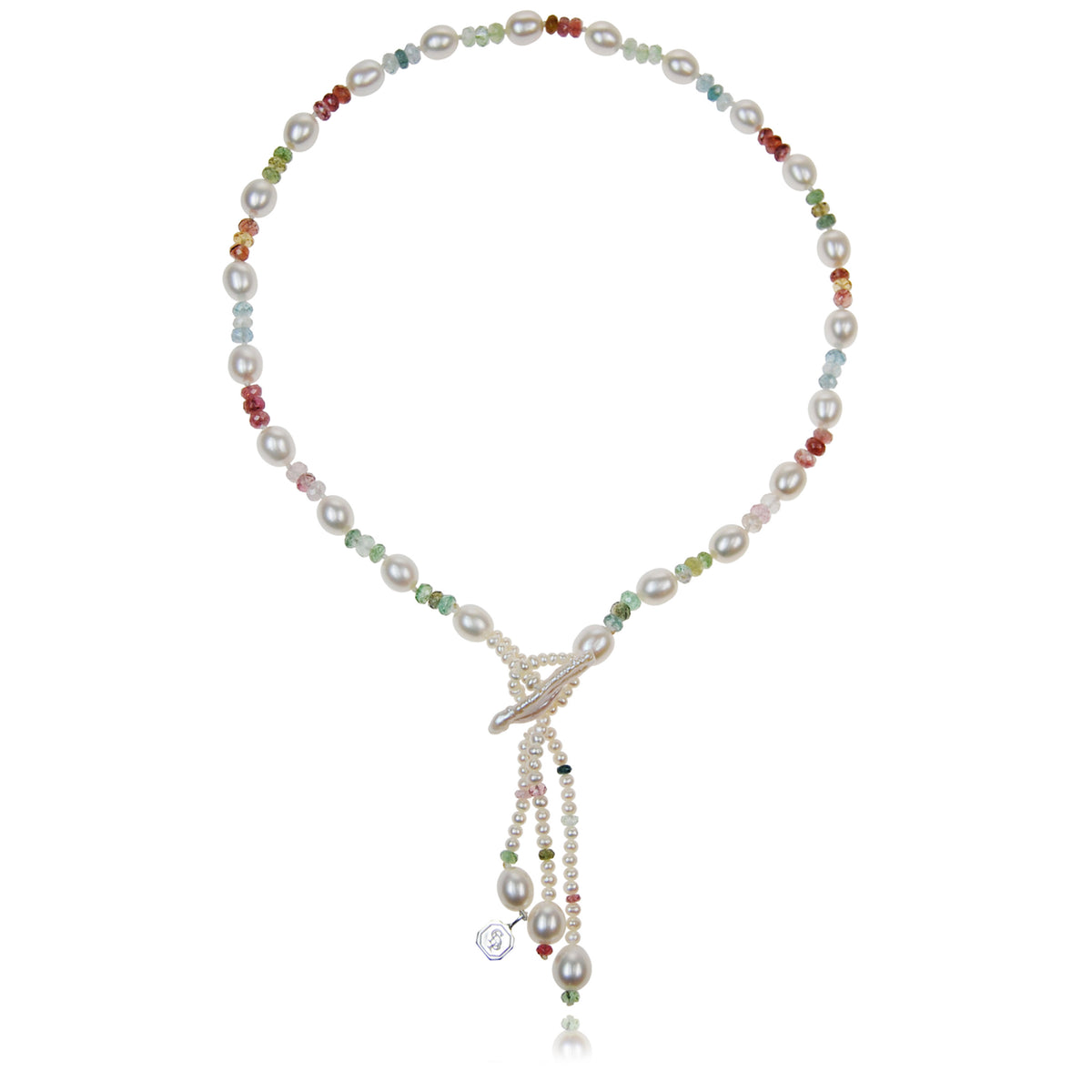 An award-winning design inspired by the vivid colours of Mexican coral reefs and sea life. This necklace interlaces creamy, Freshwater pearls with spirals of multicoloured tourmalines. The necklace can be worn alone or coupled with large drop earrings.