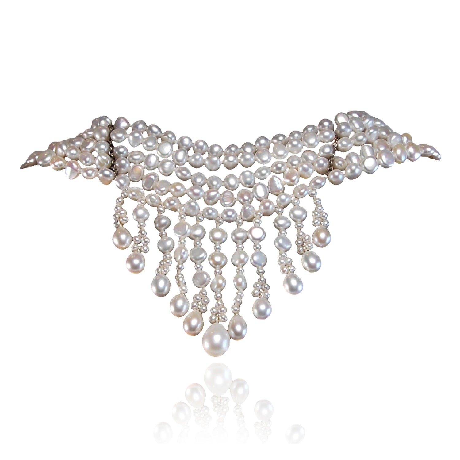 Turn heads with this opulent choker hand-set with 5 rows of shimmering white Freshwater pearls & eye-catching tassels. A limited edition design inspired by the age-old tradition of kings and queens who wore embellished ceremonial jewelry with extravagant pearls. Complete the look by pairing it with our award-winning white Freshwater pearl cuff.