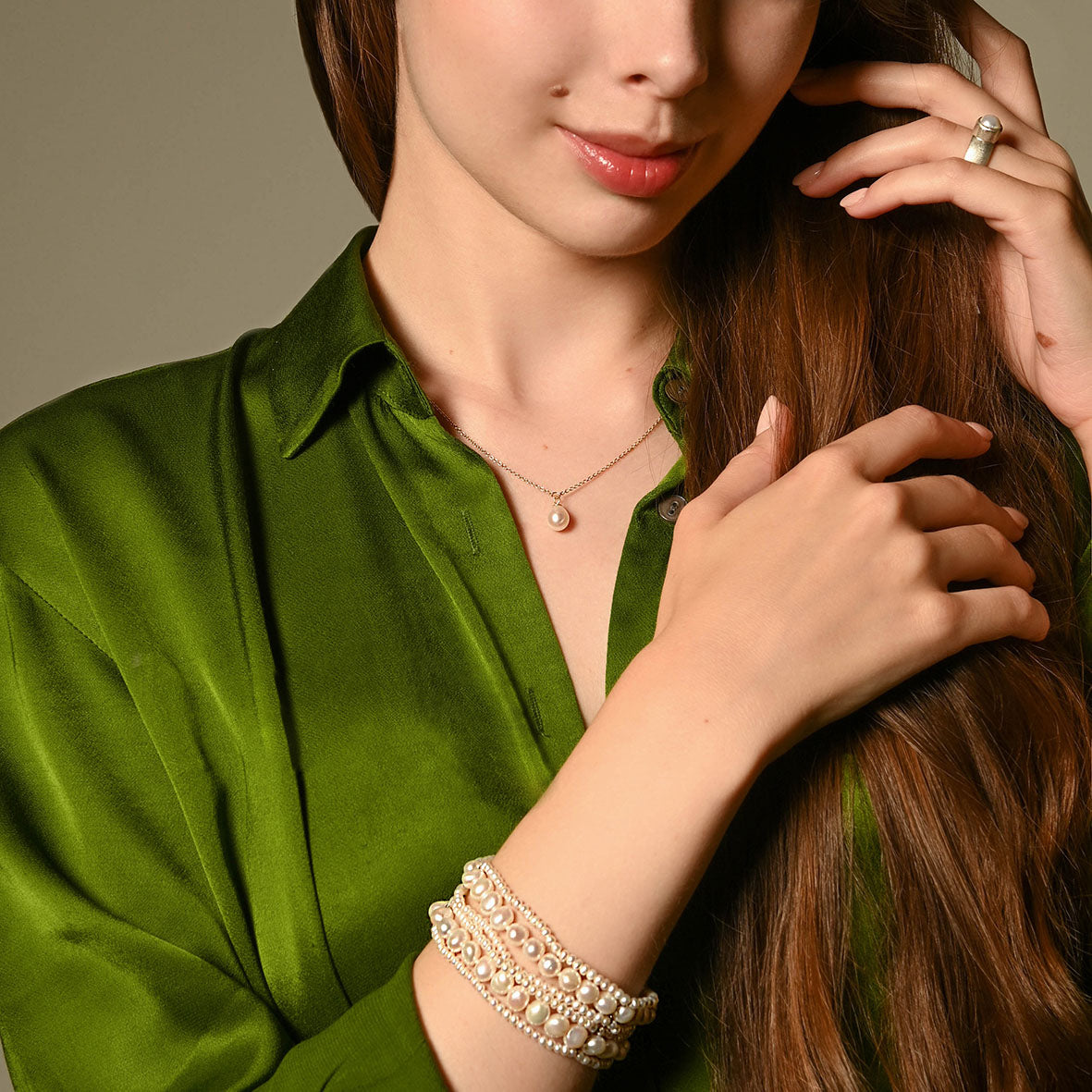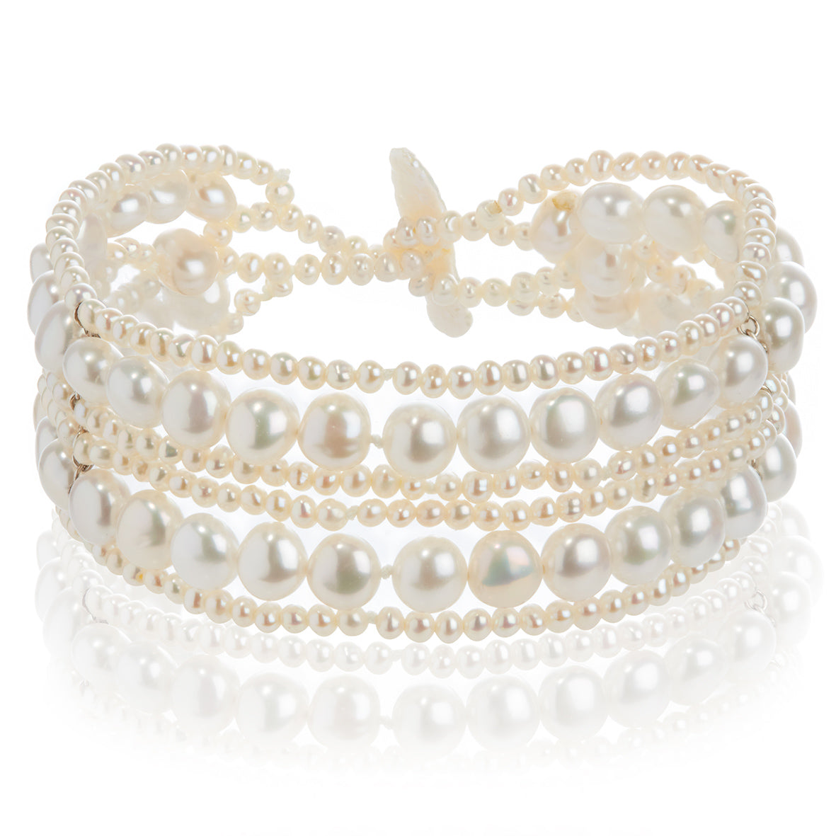 This elegant pearl bracelet has six mixed-size strands of Freshwater pearls delicately layered on top of each other. The layering creates a dramatic effect which can seamlessly transition from day to night. This creamy white Freshwater pearl bracelet with pink and peach overtones can be worn alone or combined with a matching white Freshwater pearl necklace.