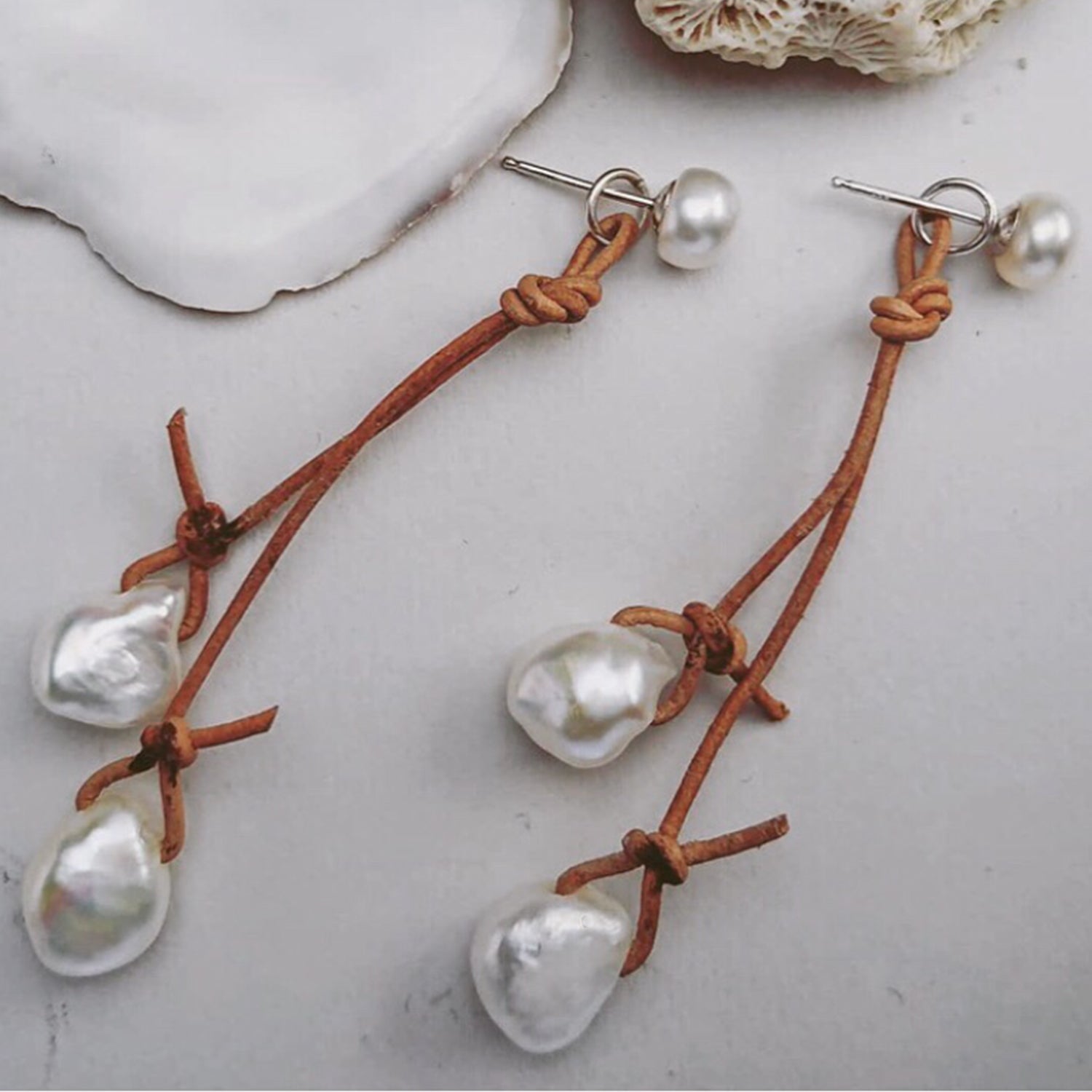 Turn heads with these award-winning “Warrior” earrings. Hand-woven tan leather set with shimmering creamy white freshwater pearls. A limited-edition design, these punchy leather earrings emulate both the strength (the leather barbed-wire) and the tenderness (the soft and creamy Freshwater pearls) found in each and every woman. Wear your personal armour alone, or coupled with our statement
