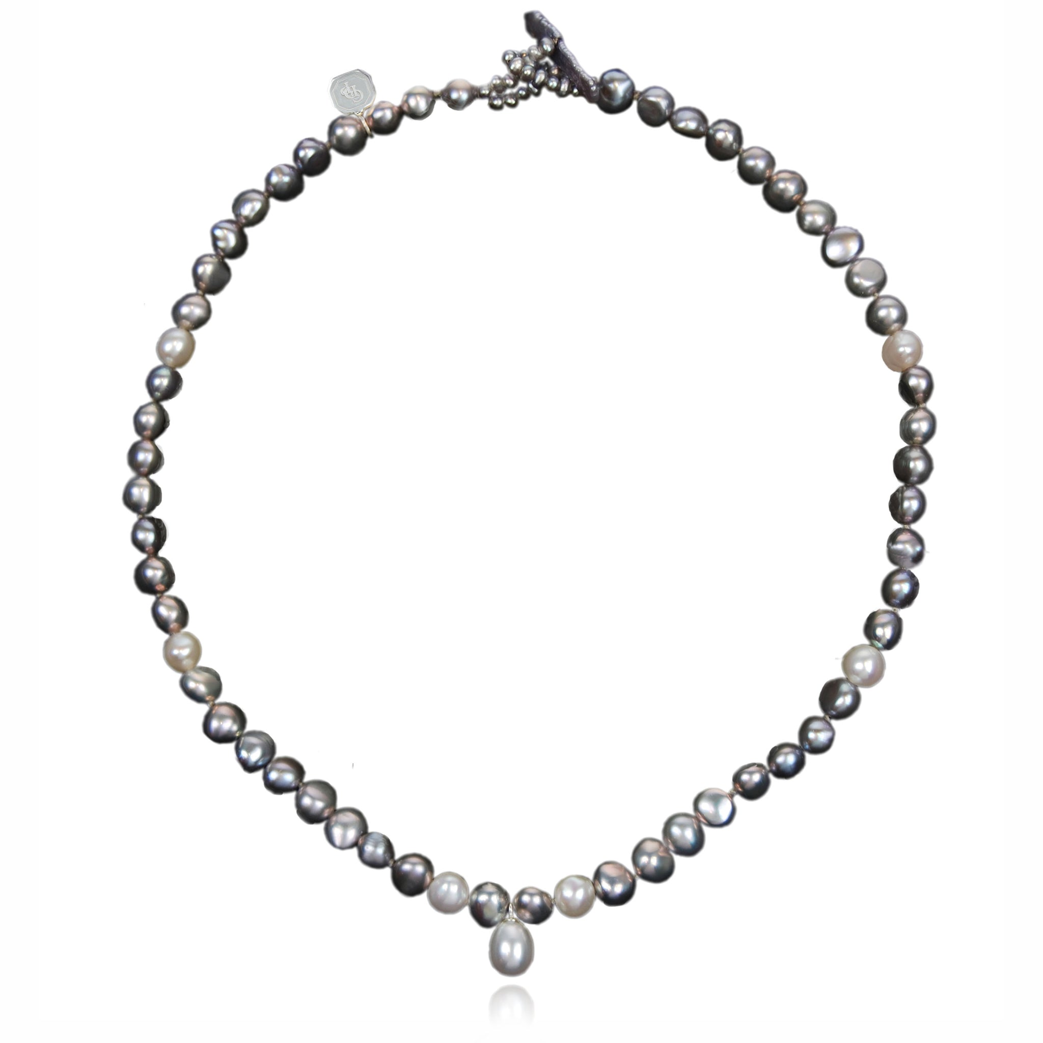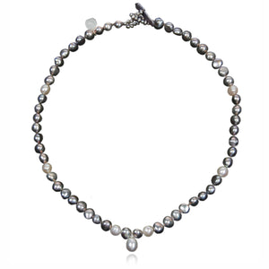 The original vintage glamour of a single strand of pearls with an elegant pearl drop - this elegant pearl necklace is crafted with cool shades of white and grey Freshwater pearls - pearls harvested in the colder months between December and March, producing pearls with the highest thickness of nacre. Each pearl is hand-selected for its soft, even shape and silky lustre - complimenting all skin tones. Pair with matching pearl drop earringsto complete the look.